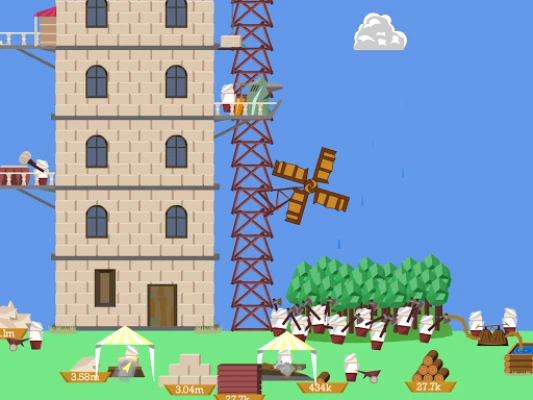 You are in charge of building the world's highest tower in this idle game. Gather or produce necessary resources and reach the sky! Start as an idle miner tycoon: upgrade quarry, hire stone miners, produce bricks, make upgrades. Then chop wood, expand lumbermill, build a crane to deliver bricks to the higher floors of your idle tower.