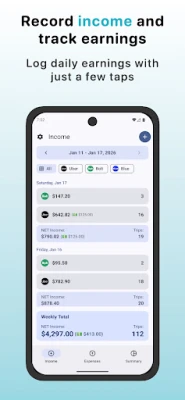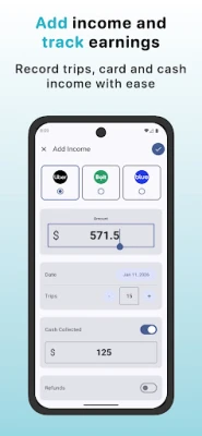 • Record income – Log daily earnings for each platform (Uber, Bolt or Blue), trip count, and other amounts (cash or refunds).