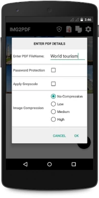 • Supports compression of images. By default, no compression mode is selected so quality and size of resulted PDF will be exactly same as selected images. Choose Low, Medium or High compression to reduce PDF size. Low compression will reduce PDF size by maintaining image quality so it is highly recommended to select for compression. High compression will reduce PDF size to maximum extent however, it is advisable to only select high compression when you have selected high resolution images.