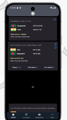 In this screen we update pitch report for upcoming or today's match with Cricket stadium records and head to head stats. In the pitch report section we provide pitch report according the previous records and then official live pitch report during the live game.