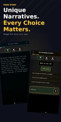 Every genre has its own visual atmosphere - colours, fonts, and effects shift to match your story. Words can flash, shake, and glow as key moments hit. Sound and music respond to the mood of each scene. Play in Text Only mode for a pure reading experience, or go Cinematic for the full spectacle.