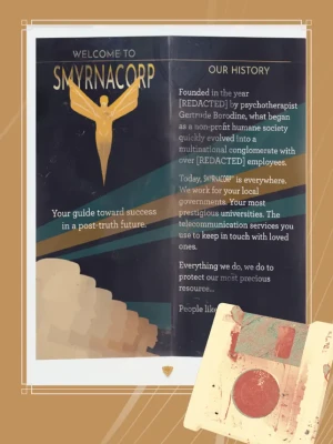 Take part in an expansive choose-your-own-adventure horror story, where you’ll uncover the secrets of an anachronistic corporation reigning over a post-truth world. Solve cryptic riddles, make difficult choices, and escape the depths of SMYRNACORP with your mind intact, no matter the cost.