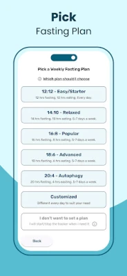 Get started with beginner-friendly options like 12:12 or jump into 16:8, OMAD, or other intermittent fasting plans. The fasting timer keeps you accountable with visual countdowns and smart reminders. Whether you're fasting to burn fat or improve focus, the app adapts to your needs.
