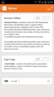 - l’accesso veloce, che consente di utilizzare le funzionalità informative senza dover inserire il codice O-Key; in caso di accesso veloce attivato le operazioni dispositive sono sempre protette dal codice O-Key (a meno che sia attivato il Fast Trade) e i dati personali parzialmente nascosti dagli asterischi;