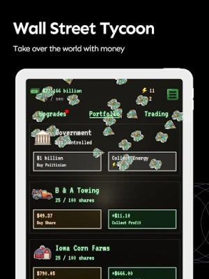 CONTROL THE GOVERNMENT Use your wealth to donate to politicians and take control of the government. Controlling the government gives you energy which you can multiply by trading. Energy boosts your profits even more. Control the entire government to knock out the people above you on the leaderboard.