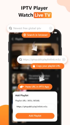 - Use a search engine to search for "public IPTV playlist", open a link from the results, copy the M3U/M3U8 link, and import it into our IPTV Player app by clicking the "Add" button.