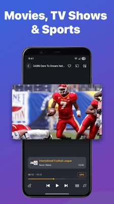 Browse easily through categorized channels — Sports, News, Movies, Entertainment, Kids, and more. Designed with a clean layout comparable to modern TV smart player interfaces.