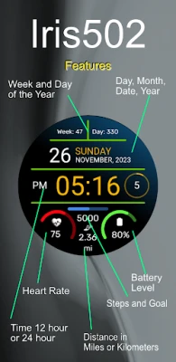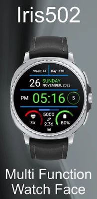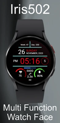 Iris502 is a multi-function digital watch face for Wear OS smartwatches. It displays time, date, battery level, steps, heart rate, and more in a clear layout. Users can customize colors and shortcuts to match daily needs.