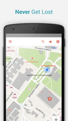 The Istanbul Offline Map and the Istanbul City Guide content are fully downloaded and stored on your device. All features, such as address searches and your GPS location also work offline and without data roaming (an internet connection is of course required for initial downloading of data or booking hotels).