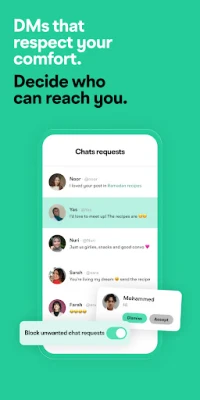 Content is moderated and monitored 24/7 to keep your experience respectful and halal. Stay in control of your space, hide your profile, and block or report users instantly.