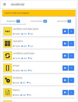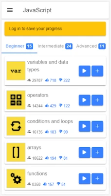 ⭐ Progress through JavaScript quizzes and questions categorized into beginner, intermediate, and advanced levels. Develop your skills at your own pace.