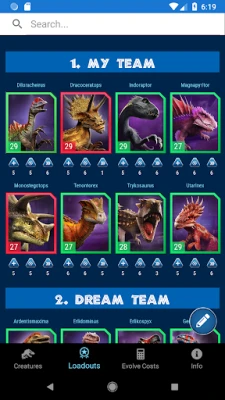From either the Creatures tab or Loadouts tab, tapping on a dinosaur will take you to the full details screen. From there, you can: