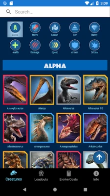 With JWA Field Guide, you can view the entire list of in-game dinosaurs. The Search box allows you to quickly find any dinosaur by entering any part of its Name, Tier, Rarity Type, Moves, or Spawn Details!