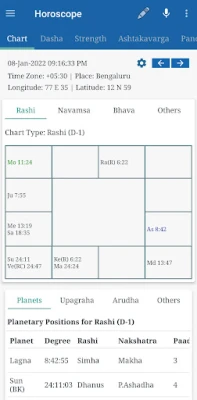 -- Has a Chart Widget which shows the position of planets for the current date, time and default place. This is used to analyze Gochara or Transit results.