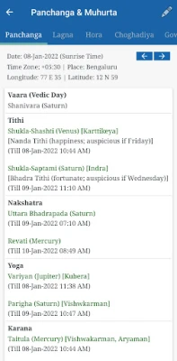 -- Panchanga widget shows basic Panchang details along with current Hora.