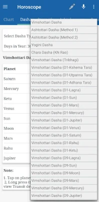 -- Different Dasha systems like Vimshottari, Ashtottari, Yogini, Tribhagi and Chara Dasha. Dasha details up to Prana-antara Dasha.