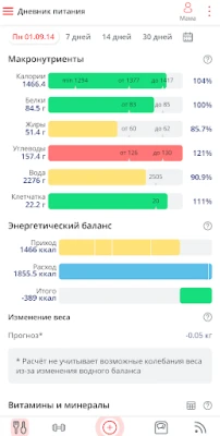 Баланс натрия и калия, источники нутриентов, рейтинг продуктов в рационе и другие отчёты.
