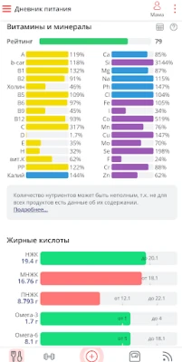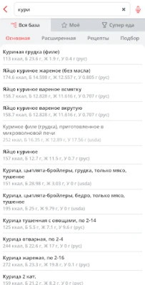 Проверенная база продуктов из более чем 7000 наименований с полным химическим составом (калорийность, бжу, витамины, минералы, жирные кислоты и другие нутриенты)