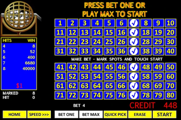 It works similarly like a lottery; place a bet, mark 2-10 numbers and hope the machine picks some, or all, of your numbers chosen from the 20 randomly selected ones. If you hit a certain amount of numbers then you win. The more numbers you hit the more credits you get!