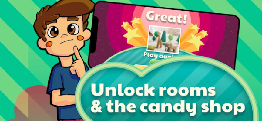 Explore different objects, shapes, and colors by unlocking rooms in your house. Earn coins and start collecting different sweets from the candy shop.