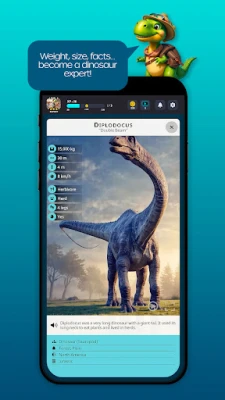 - A correct answer gives XP points and unlocks the dinosaur’s info card: name, weight, height, speed, and a spoken description.