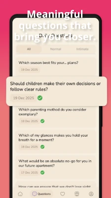 Open Kindred once a day to answer a question together. Some are playful, some are deep, and many are the ones you wish you’d asked earlier.