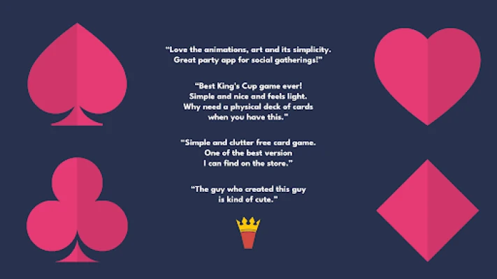 Set out to be a simple yet awesome party game 🥳. Even when you’re stranded in the middle of the ocean 🌊 or trapped in the forest 🌳 with your FRIENDS, King’s Cup will always be there for you. As long as you still have juice 🔋 left on your phone 📱.