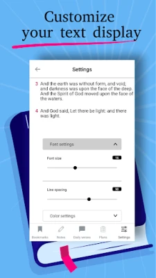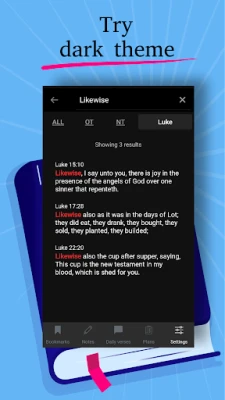 • Customizable Interface: Set up a dark theme and adjust font sizes for comfortable Bible reading.