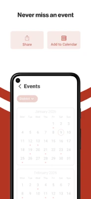 NEVER MISS AN EVENT The event section shows a list of events throughout the district. Users can add an event to their calendar to share the event with friends and family with one tap.