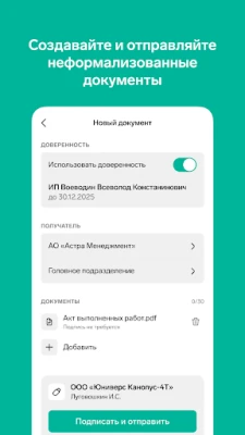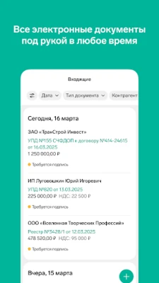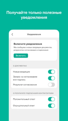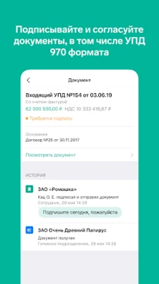 В мобильном приложении можно: - Получать уведомления о вновь поступивших электронных документах - Отслеживать изменение статуса документа - Создавать неформализованные документы - Подписывать и отправлять на согласование форматы документов, указанные в приказе ФНС России от 19.12.2018 №820 - Подписывать и отправлять на согласование неформализованные документы - Отказывать в согласовании - Просматривать печатную форму документа