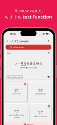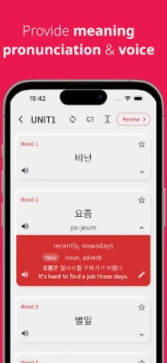 It is important to study words every day! You can review the studied Korean vocabulary by part, unit, or whole words.