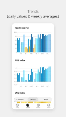 1) Readiness Measurement Mode monitors changes in your daily readiness status. By doing short (1-5 min), controlled resting HRV measurements regularly, you will receive reliable information about your physiological recovery and/or stress, how it changes from day to day, and how your HRV values compare with normal population values. Readiness monitoring is used by professional athletes in training optimization but can also be used by sports enthusiasts or anyone interested in their wellbeing, as it provides objective information about overall bodily stress as well as cardiovascular health.