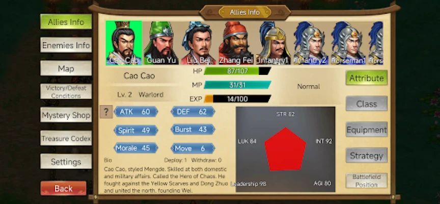 Mythic/Fantasy Route: Zhuge Liang is controlled by a Demon King and plots against Liu Bei, joining Eastern Wu to fight Cao Cao. In the end, Cao Cao triumphs and unites the realm. In the mythic ending, you can recruit the legendary general Guan Yu, famed throughout the Three Kingdoms.