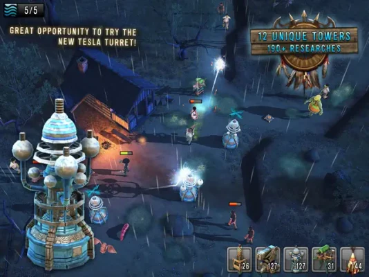 - 12 Different Towers to defend yourself with, each with a unique research tree to make them even more powerful! Pierce the zombies with arrows from an Arrow Tower, blow them to pieces with a Mortar Tower or electrify them with a Tesla Tower.