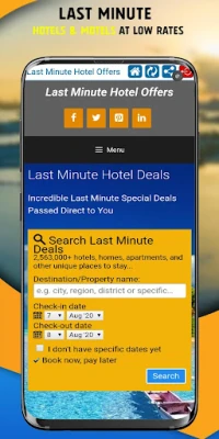 Simply download the Last Minute Hotels & Motels app, enter your destination and dates, and browse the best offers available. Don't miss out on amazing deals for your next trip.