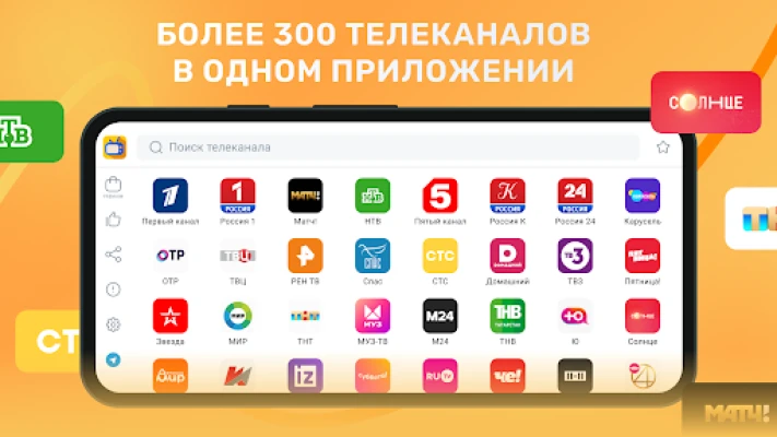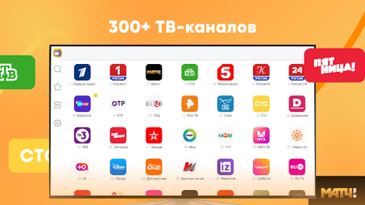 300+ телеканалов онлайн-ТВ бесплатно — всем, всегда и везде (как минимум на территории РФ). Первый, Россия 1, Россия 2, Россия 24, ТНТ (и ТНТ premier), Россия - Культура, Мир, Пятый канал, Че, Матч (и Матч премьер), Звезда, Пятница, НТВ (и НТВ плюс), Карусель, СТС (и СТС лав), Домашний, 2х2, Ю, Москва 24 и др. ТВ-каналы