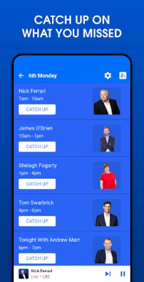 • Catch Up: Your favourite shows from the last seven days are available to listen back to or you can download them – great for offline listening when you’re on the move.