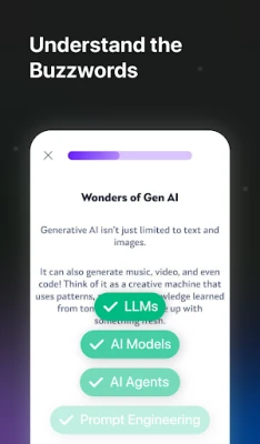 - Bite-sized & Interactive AI Lessons: Understand AI and gen AI step-by-step with easy-to-follow lessons. Complex topics like machine learning and gen AI (e.g. how ChatGPT works) are broken into simple, bite-sized chunks that make learning AI fun and engaging.