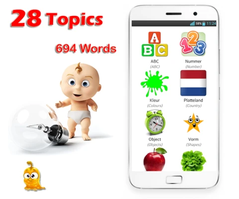 Learn Dutch for Kids has 28 topics which are around you real life, 768 words vocaburaly with sound and images of them . You can use all of them without network, it’s free.