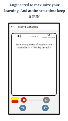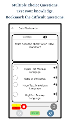 The app will help you learn the correct pronunciation of terminologies used in HTML Programming Language using English language. Following are the main features of this app 1. Supports pronouncing HTML Programming Language terminologies in English Language 2. Uses Text to Speech Engine for Audio Functionality 3. Quizzes 4. Study Mode 5. Bookmarking Study Flashcards and Quiz Questions 6. Progress Indicators for Every Chapter 7. Visualization for Overall Progress