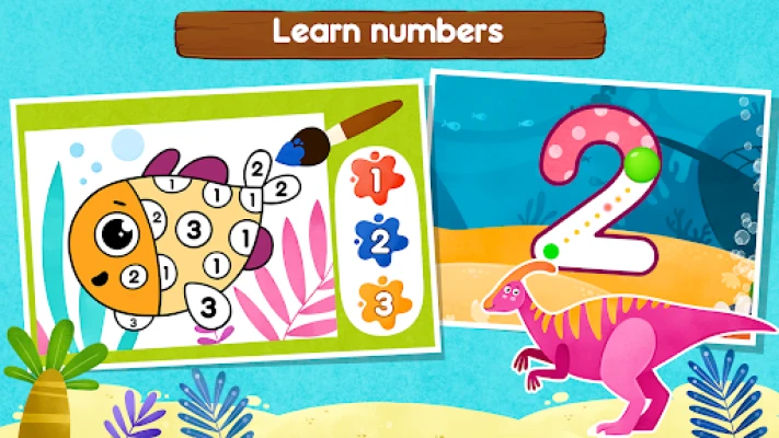 Learning games for kids featuring dinos are intended for boys and girls aged three and older. Part of the content is covered by a free version. The tasks that are always available include the Alphabet, ABC Letters, Numbers 123, a couple of coloring pages, and animal jigsaw puzzles. During the free trial period, you can access all tasks.