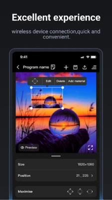 2. Rich program types for various scenarios - Pictures, videos, texts, analog clocks, digital clocks, weather, web pages, and more media. 3. Two modes - LAN and Internet control for different scenarios. 4. Device management - Full-featured device management. 5. Storage media on Cloud - Manage or use your media with mobile phone anytime anywhere.
