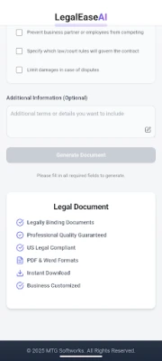 - US law compliance: Updated templates reflecting federal and state requirements - Multiple document types: NDAs, Terms of Service, Privacy Policies, employment agreements, and more - Business-specific tailoring: Adapt clauses to your sector, workforce size, and operational footprint - Instant delivery: Export polished PDFs and DOCX files for immediate use - Secure history: Regenerate or re-download past documents whenever you need them