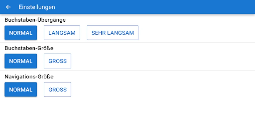 • NEU: Durch individuelle Einstellmöglichkeiten der Größe von Buchstaben oder Navigationsfeldern sowie der Geschwindigkeit der Seitenübergänge kann die App an die Bedürfnisse von Kindern mit motorischen und/oder sensorischen Einschränkungen angepasst werden.