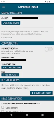 Customizable news subscription With the Lethbridge Transit account you can subscribe to the transit news you need. Subscribe to any or all of the routes and get route specific information that you need for your trip.