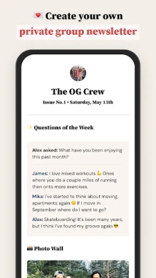 Letterloop is a fun way to have a group newsletter without the work. You pick the questions for your group to answer, then Letterloop creates a fun and beautiful newsletter with everyone's replies. All you need is to do is invite your people!