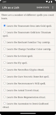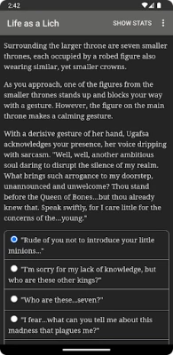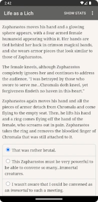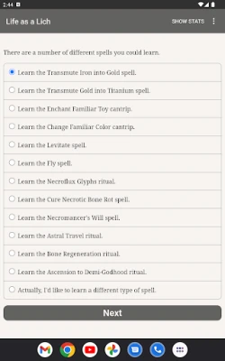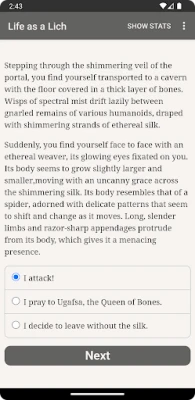 "Life as a Lich" is a 207,000 word interactive novel by Adrao, where your choices control the story. It's entirely text-based—without graphics or sound effects—and fueled by the vast, unstoppable power of your imagination. It is a sequel to both one of the endings of "Tokyo Wizard" and one of the endings of "Raiders of the Icepeak Mountains", or it can be played as a standalone game by creating a new character.
