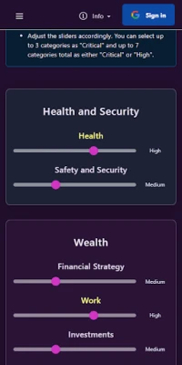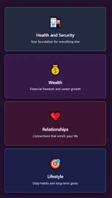 Life Categorization: a structured map of life areas (Health & Security, Wealth, Relationships, Lifestyle)