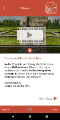 The zoomable OSM map data (© OpenStreetMap) provides easy access to the content. Both maps and content are available offline (internet connection is not mandatory). Clickable Points Of Interest on the maps start the content on request. 3D models, AR features, 360 views, video and audio sequences as well as text-/picture information are provided. An integrated GPS navigation with an alert guides you to the sites. An alternative list view shows you the available content.