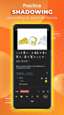 - Listen and speak Japanese, English, Chinese with shadowing, voice record, subtitles, game